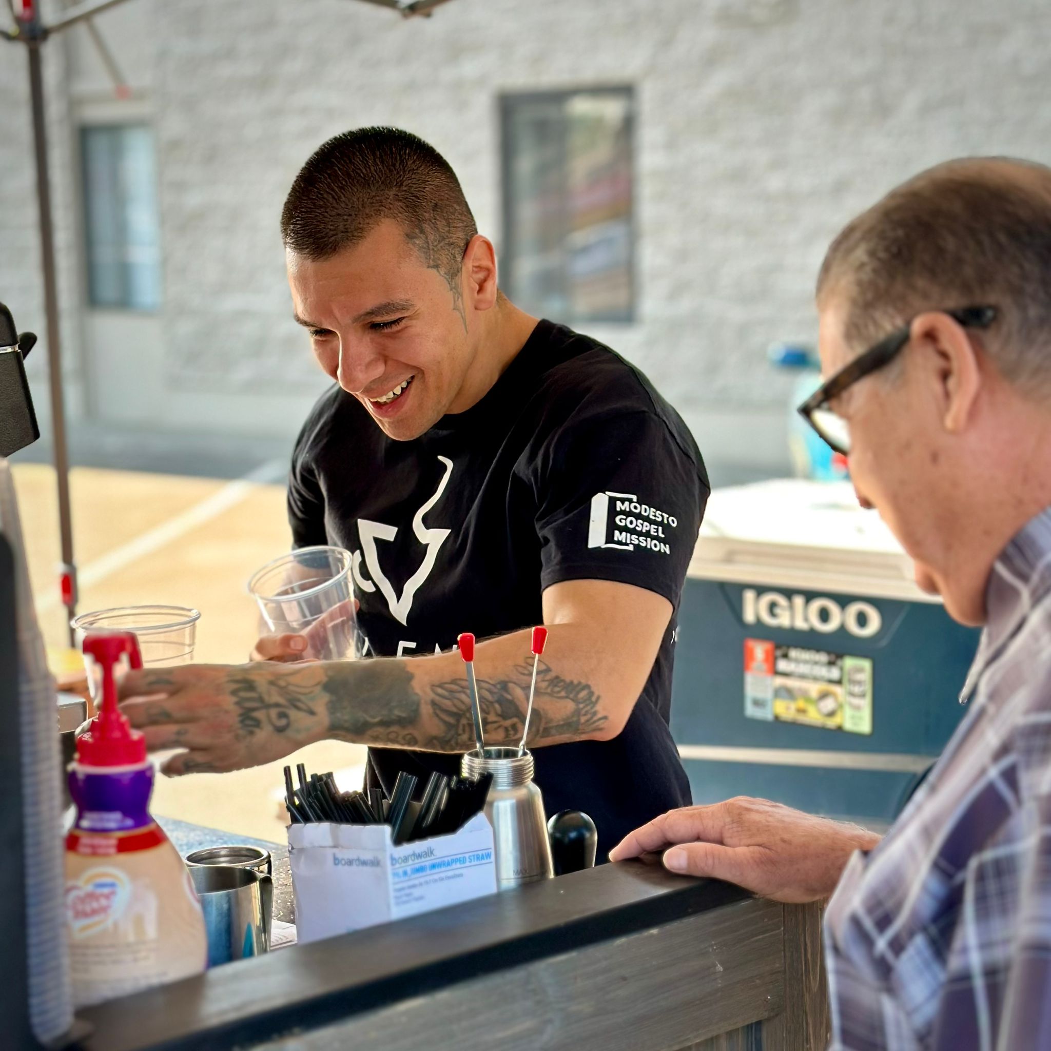 “I remember moving a lot as a kid, we even stayed in a bunch of hotels. As I got older, I started to pay attention to the lifestyle my mother lived, but there wasn’t anything I could do. My mother was often abused by her boyfriends, then I got to the age that I was able to stop it. Eventually, I became a gang member, using and selling drugs. I faced incarceration, followed by a cycle of living in different places, again. After facing juvenile hall, jail, and then prison, all because of drugs, bad decisions, and bad company, I finally surrendered and came to the Mission to join the New Life Program. I never knew a place like this existed. Since being here I have regained my work ethic and when the opportunity arose for me to join Volente Coffee I joyfully accepted. This is a brand-new experience for me. I love challenging myself. I love to see people smile and the reason that Volente matters to me is because I love to serve a good cup of joe with joy. My life has been a roller coaster, but I am so grateful that I was told about the Mission.”